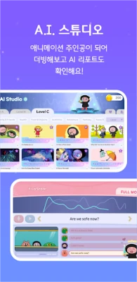 방대한 양의 콘텐츠로 영어에 대한 흥미를 한층 더 높여드립니다. 700여 편에 달하는 다채로운 애니메이션 영상과 400여 편의 풍부한 스토리북은 마치 미지의 세계를 탐험하듯 몰입감을 선사하며 자연스럽게 영어를 접하게 합니다. 여기에서 그치지 않고, 애니메이션 더빙 활동을 통해 직접 캐릭터가 되어보는 특별한 경험을 제공합니다. 이는 단순한 시청을 넘어 AI 스피킹 훈련으로 연결되어, 말하기 자신감을 키우고 실질적인 영어 회화 능력을 향상시키는 데 큰 도움을 줍니다.