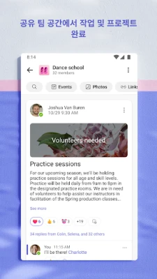 "Microsoft Teams"는 단순한 소통을 넘어선 연결을 선사합니다. 가족, 친구, 팀 동료, 그리고 커뮤니티와 안전하고 편리하게 교류하세요. 이제 Skype의 핵심 기능들이 "Microsoft Teams"에 통합되어 더욱 확장된 소통의 장을 제공합니다. 몇 초 만에 모임을 개설하고 링크 하나로 모두를 초대하거나, 1:1 대화부터 그룹 채팅까지 자유롭게 소통할 수 있습니다. @멘션을 통해 중요한 소식을 알리고, 필요할 땐 즉시 음성 또는 영상 통화로 전환하여 더욱 생생한 대화를 나눠보세요. GIF, 이모지, 메시지 애니메이션으로 감정을 풍부하게 표현하며 즐거운 소통 경험을 만끽할 수 있습니다.