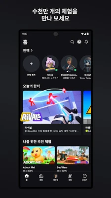 Roblox에서 수백만 가지 독특한 체험을 플레이하고, 제작하고, 탐험하며 무한한 재미를 경험하세요. 상상하는 모든 것을 현실로 만들고, 전 세계 친구들과 함께 흥미진진한 모험을 떠나세요. 나만의 가상 세계를 만들고 공유하며 특별한 경험을 즐겨보세요.