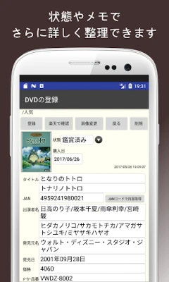 작품 등록은 번거롭지 않습니다. 바코드 스캔, 바코드 직접 입력, 웹 검색, 그리고 수동 입력까지 네 가지 방식 중 가장 편리한 방법을 선택할 수 있습니다. 특히, 연속 바코드 스캔 기능은 여러 장의 DVD를 한 번에 빠르게 등록할 수 있어 시간을 절약해 줍니다. 등록된 각 DVD에는 '구매 예정', '렌탈 예정', '미시청', '감상 완료' 등 다양한 상태를 설정하거나, '속편 구매'와 같은 개인적인 메모를 자유롭게 추가할 수 있습니다. 이러한 상태와 메모는 저장되어 다음 입력 시 선택할 수 있으며, 강력한 검색 기능으로 원하는 정보를 정확하게 찾아낼 수 있습니다.